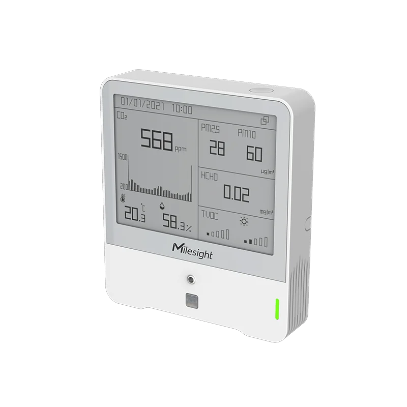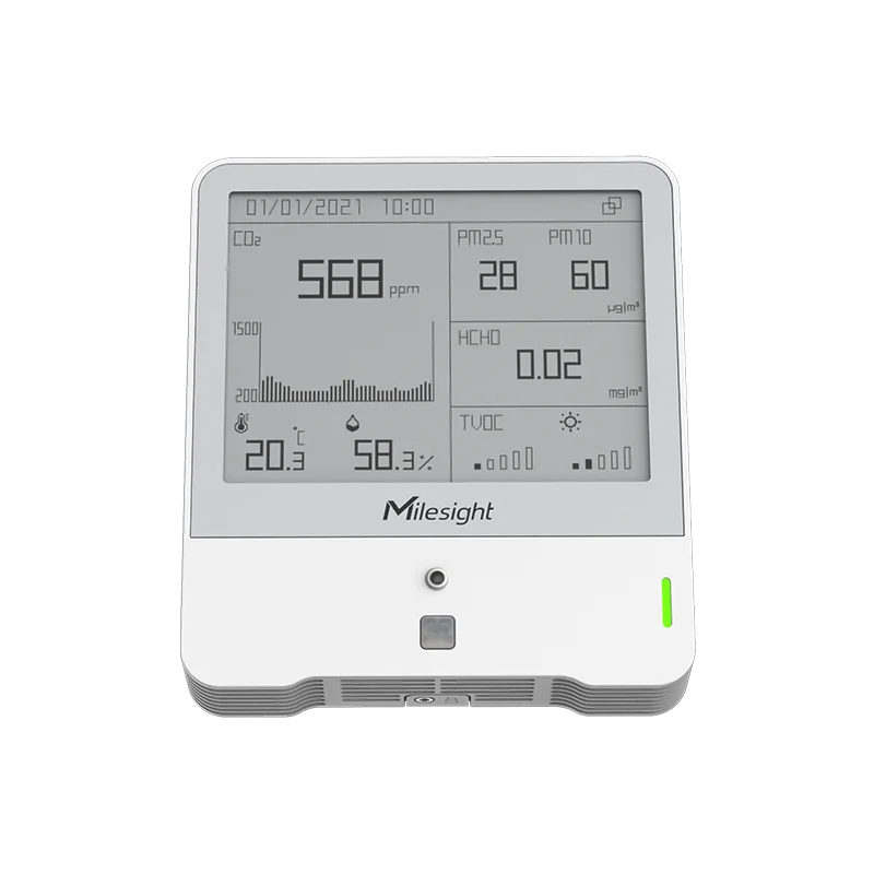 AM319 is a compact indoor ambience monitoring sensor formeasurement of temperature, humidity, light, CO2 concentration, HCHO/O3 level, TVOC, barometric pressure, PM2.5, PM10 and motion. The data will be shown on the E-ink screen in real-time, which helps to measure the indoor environment and comfort. Sensor data is transmitted using LoRaWAN® technology.